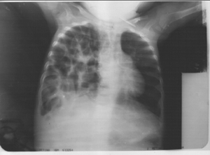 Chest radiograph reveals an anterior parasternal hernia with multiple air filled spaces with haustrations suggestive of intestinal loops within the right hemi-thorax suggestive of Congenital diaphragmatic hernia {CDH}. It is characterized by an incomplete formation or fusion, muscularization of the diaphragm resulting in apparent absence of the diaphragm or eventeration. The three basic types of CDH include the posterolateral Bochdalek hernia {occurring at approximately 6 weeks gestation}, the anterior Morgagni hernia and the hiatus hernia. Cryptogenic congenital diaphragmatic hernias has been a cause of sudden deaths in the early months of life. Mortality is significant at 50 percent depending on the other associated malformations. Associated high mortality rates which have not improved significantly despite advanced novel aggressive intensive perinatal and infantile interventions, are related directly to co-existent pulmonary hypoplasia or intractable persistent pulmonary hypertension, which are usually recalcitrant. Advanced novel therapies for CDH have included delayed operation, extracorporeal membrane oxygenation {ECMO}, high frequency oscillatory ventilation {HFOV}, surfactant ,and inhaled Nitric Oxide {INO} therapy. However,the effects of these modalities in terms of proffering a statistically significant survival advantages in neonates with CDH have not