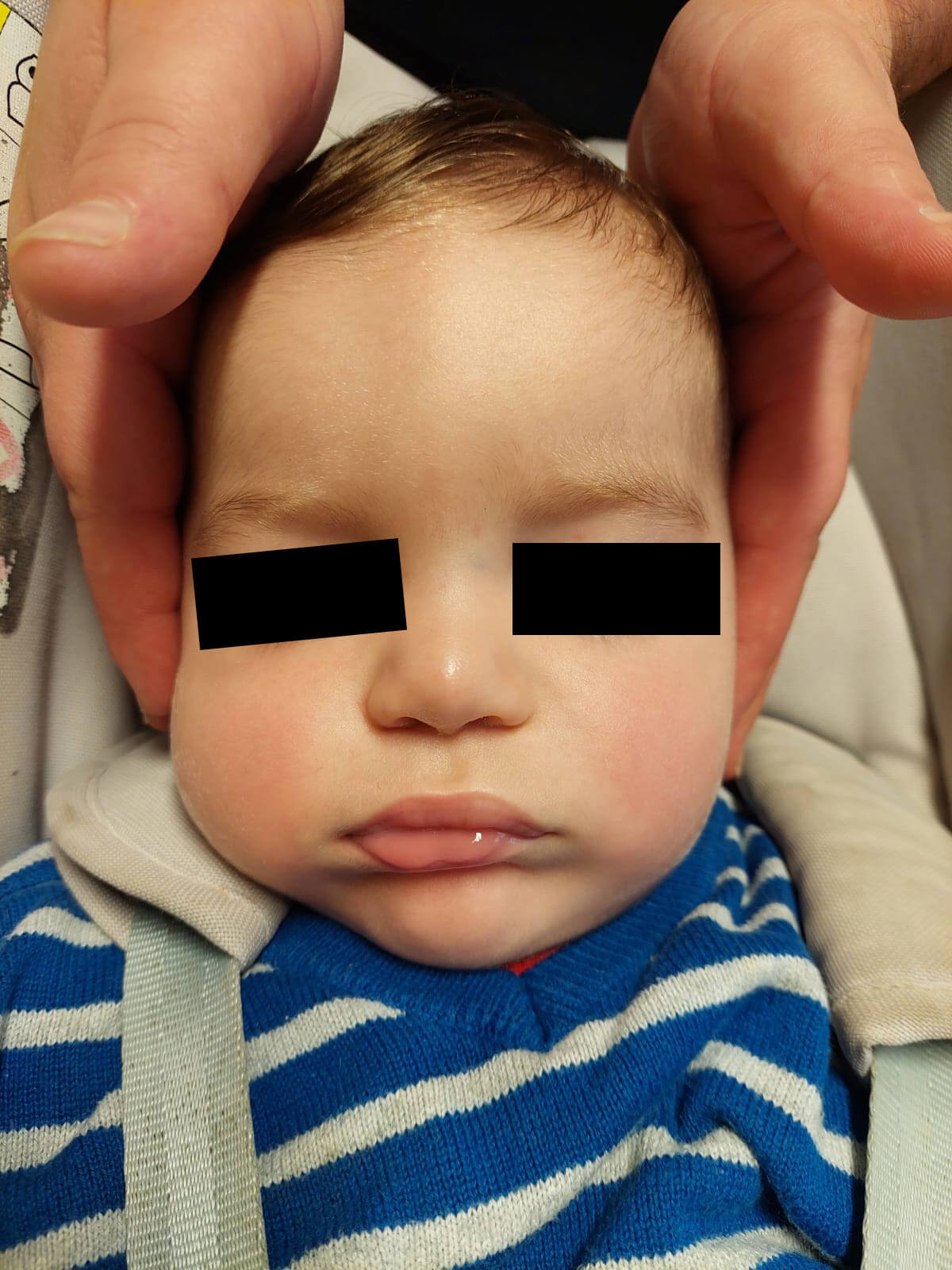 Question: A seven-month-old male infant presented to the emergency department with mild respiratory symptoms. During the observation, asymmetry of the face with a downward deviation of the right labial commissure was noted when the patient was crying (Figure 1). At rest, the face was symmetric except for a slightly thinner and inward-turned lower left lip (Figure 2). According to the parents, these alterations have been present since the first days of life. The further neurologic assessment was normal. No other major or minor malformations were detected and cardiac auscultation was normal without murmurs. He presented normal growth and neurodevelopment. There was no history of problems with sucking or drooling and no family history of congenital abnormalities, including facial asymmetry. The patient was a second-born child from nonconsanguineous parents. Pregnancy was uneventful and the patient was born at 38-3/7 weeks gestation by cesarean section because of prolonged labor, with a birth weight of 3270 g, birth length of 51 cm and head circumference of 35 cm. Apgar scores at 1, 5 and 10 minutes were 7, 8 and 10, respectively.