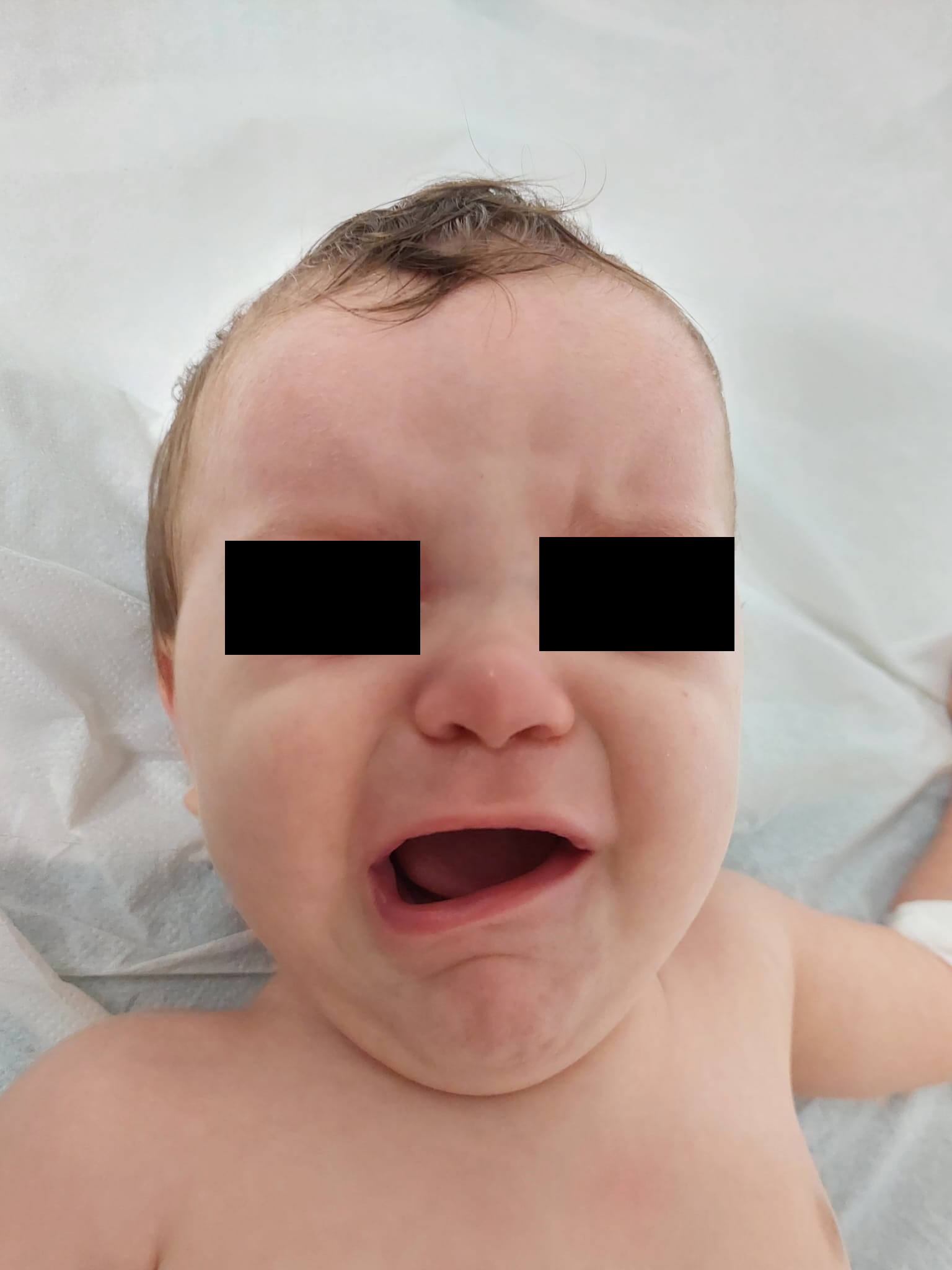Figure 1. Facial asymmetry observed when crying with the right side of the mouth deviated downward while the left side remained unmoved.